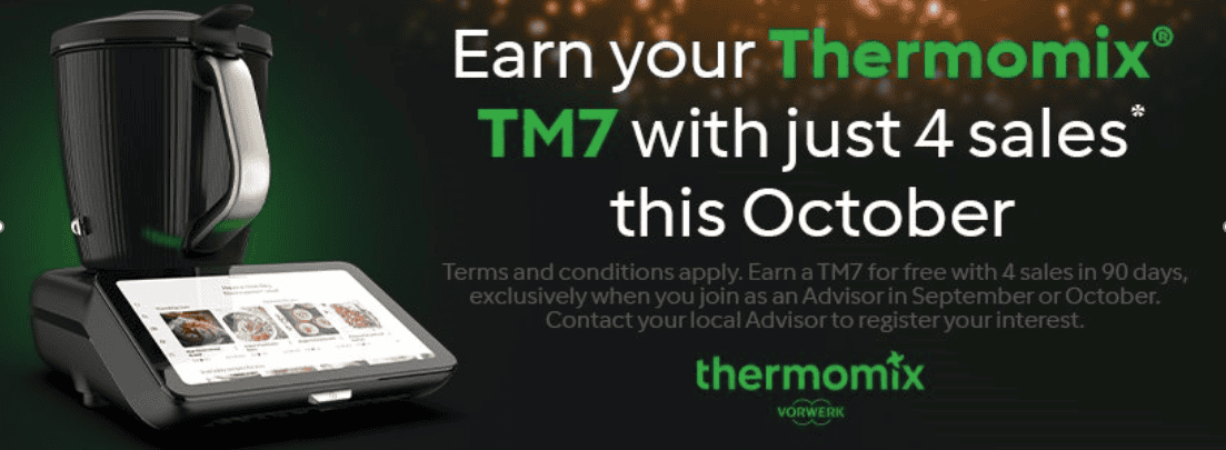 This October, you have the chance to earn your brand‑new Thermomix® TM7 absolutely FREE. Simply join us as an Advisor and achieve 4 sales within 90 days – your TM7 is yours with no cost!